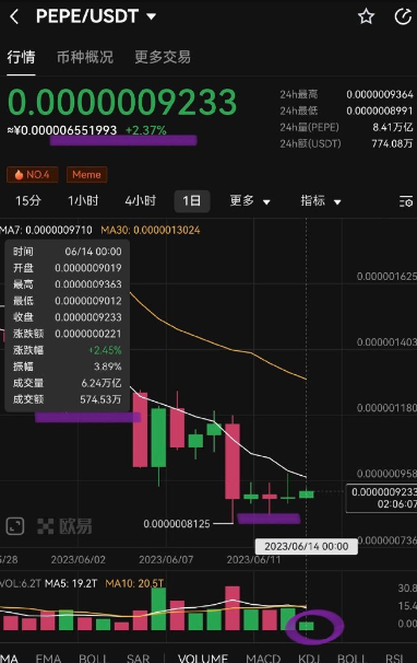 pepe币还会大涨吗在高峰期进入的 PEPE 投资者遭受了巨额损失。在这一点上,整个加密市场都在下滑,尚不清楚 Pepe Coin 是否会上涨或继续下跌。上个月,以青蛙为灵感的模因硬币引领了模因硬币狂潮。然而,所有的炒作似乎都已经冷却下来。 目前pepe在绝对低位相对缩量十字星横盘三日,多空双方如此势均力敌,其实也是强庄控盘的体现之一。 而今日明显的极度缩量上涨,虽然筹码廉价,总体资金投入量小,但已处于绝对低位的位置上,御姐认为诱多的可能性不大。 此刻建立头仓是合适的。