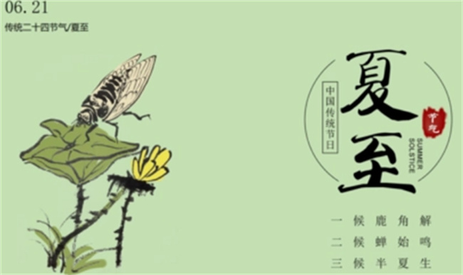 夏至代表着盛夏的到来,在夏至这天,有早晨吃麦粥,中午吃馄饨习俗,寓意为四季安康人团圆。夏至是农历的第十一个节气,通常出现在公历的6月21日左右。夏至标志着一年中白天最长、黑夜最短的时刻到来,也代表着盛夏的开始。根据中国古代传统观念,夏至是阳气最旺盛的时候,人们应该注意养生保健,以适应即将到来的酷暑。