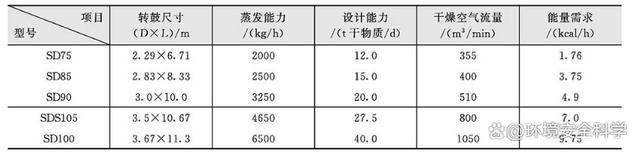 ① 在无氧环境中操作,不产生灰尘。② 热效率高,由于污泥与干燥介质直接接触干燥,减少了热传导过程中的能量消耗,另外干燥时间短,降低了热量的辐射消耗;③ 污泥干化能力强,干化程度在90%以上,颗粒直径控制在1~4mm,防止污泥过度干化,可用作肥料或园林绿化;④ 工艺气体循环率高,可达到90%左右,因而有害气体排放低,对环境影响轻微,同时减少了有害气体的处理成本;⑤ 细小的干燥污泥被送到混合器中与湿污泥混合送入转鼓式干燥机,以避免高黏附性导致污泥黏结转鼓表面或产生结块;⑥ 对于加热转鼓干燥机的燃烧器,可使用沼气、天然气或热油等作为燃料,厂家可根据自身情况选择合适的燃料来加热转鼓干燥机;⑦ 干燥机特殊的三通道结构,能够最有效地利用热能和结构空间,这就使得设备的体积小,干燥能力强;⑧ 直接加热转鼓干化技术中设置了能量回收系统,减小了热能的消耗,降低了污泥干化的成本。 三级转鼓干燥机干燥能力比较大,充分利用干燥机的内部空间,干燥效果好,不同型号下设备的干燥能力及能量需求详见表图1。