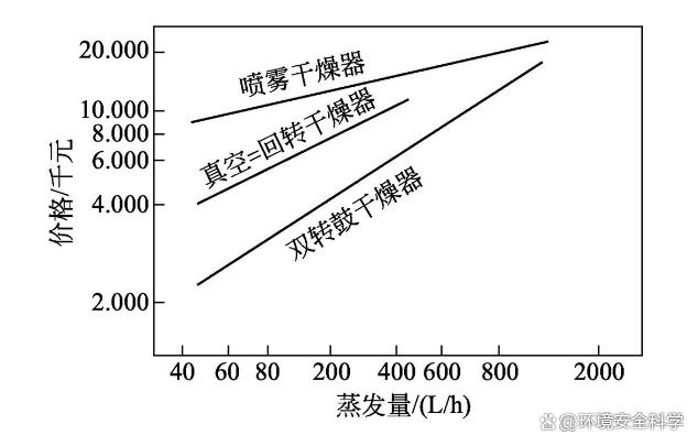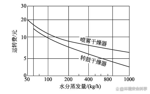② 投资和操作费用低,从图1中可明显看出转鼓干燥机的操作费小于喷雾干燥机,约为喷雾干燥机的1/3。从图2中可以看出,在投资费用上,相同蒸发量的条件下,转鼓干燥机投资费用要比其他两种干燥机小。