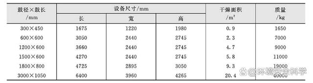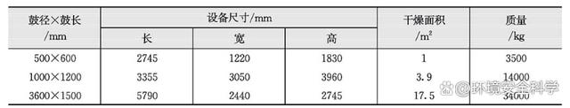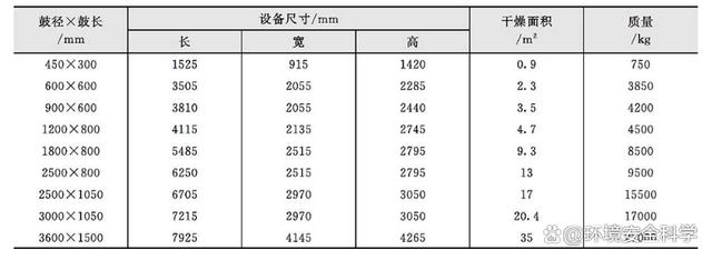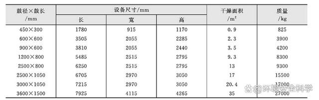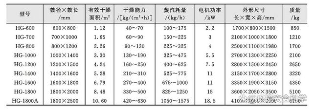 (1)单鼓干燥机 常压单鼓干燥机结构如图10所示,适用于溶液或稀浆状悬浮液物料的干燥,布膜方式常为浸液式或喷溅式,料膜厚度为0.5~1.5mm,转鼓转速为2~10r/min,筒体内蒸汽压力为0.2~0.6MPa,筒体直径大多在0.6~1.8m范围内。负压单鼓干燥机是将转鼓置于全密闭罩,进行负压操作。带压辊的单鼓干燥机,其结构如图11所示,多用于干燥薄而密实的片状制品,如膏状、含淀粉或食品类物料。转鼓和压辊的组合结构可以使得被干燥物料在转鼓表面成膜均匀,压辊还可以使物料层和转鼓筒体的外壁接触良好,降低传热热阻,减少热量消耗,提高干燥效率。普遍使用的转鼓干燥机为HG型常压单鼓干燥机系列,其技术参数见图12。负压单鼓干燥机的技术参数见图13。