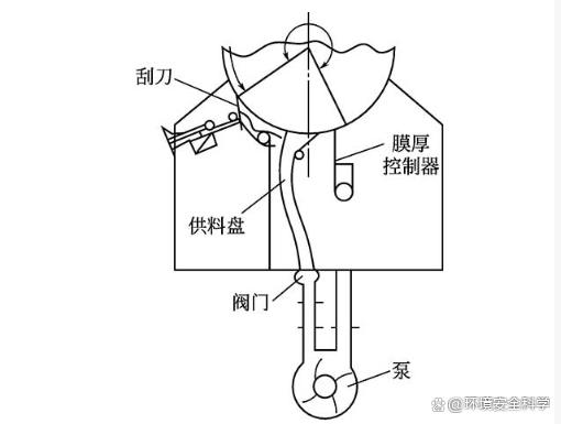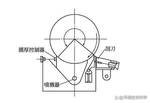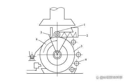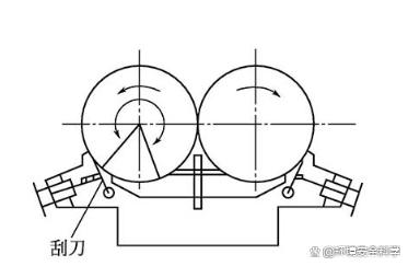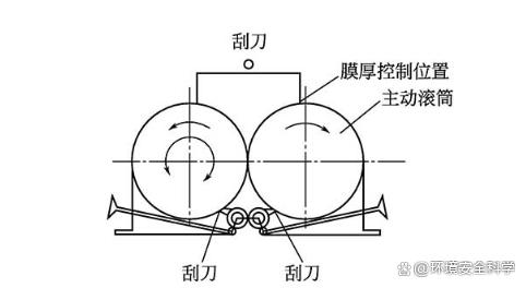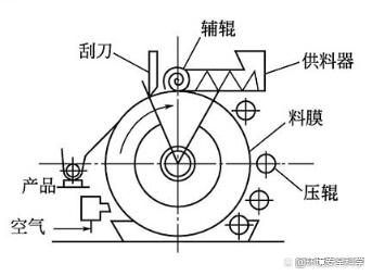 1—辅辊;2—进料器;3—料膜; 4—压辊;5—刮刀;6—转鼓