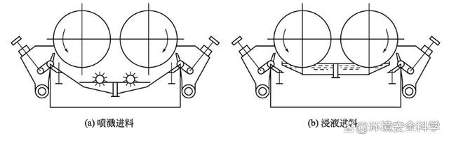 间接加热转鼓干燥机按鼓数可分为单鼓干燥机、双鼓干燥机和多鼓干燥机。其中双鼓干燥机按照双鼓的转动方向和进料方式可分为双鼓和对鼓两种形式。根据物料特性的不同可分为常压型和真空型两种。根据进料的方法可分为双鼓浸液式(下部进料)、双鼓浸液式(中心进料)、单鼓搅拌浸液式、对鼓喷溅式、单鼓喷溅式、单鼓泵输送浸液式、单鼓辅辊布膜式、组合复式浸液布膜式、单鼓侧向式。图1-图9为不同进料的方法分类。