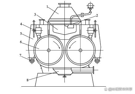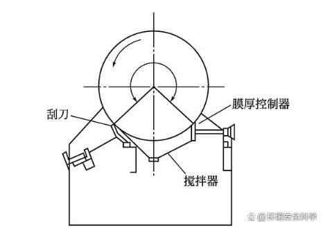 1—热介质出口旋转接头;2—料液贮槽;3—旋转筒体;4—排气管;5—排液缸吸管;6—传动装置;7—刮刀及调节装置
