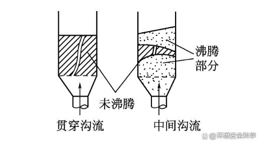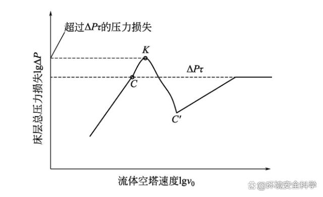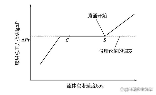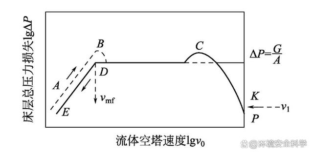 (3)聚式流化床中常见的几种不正常现象 1)沟流 在流体通入固定床层时,由于各种原因导致流体在床层中分布不均匀,在床层的局部地方产生了短路,使相当多的流体通过短路流过床层,此时即使通过床层的气流速度大于临界速度,床层却也不会发生流化,见图4。在流化床干燥机中若产生沟流,会使干燥介质与被干燥的污泥接触不良,从而降低干燥效率。若要使其发生流化,流体流速就必须比临界速度大很多,才能使料层“开锁”。此“开锁”点即为图5中的K点,此时床层开始沸腾流化,床层压力突然下降,即由K点降到C点。此后压力损失可能随着流速的增加而出现回升,但达不到理论的压力损失值。