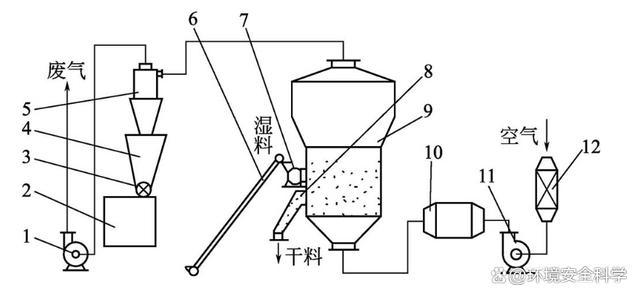 1—引风机;2—料仓;3—卸料器;4—积灰斗;5—除尘器;6—给料皮带;7—抛料机;8—卸料器;9—流化床;10—加热器;11—鼓风机;12—过滤器 (2)多层流化床干燥机 如图2所示为多层流化床干燥机的工艺流程。湿料由料斗送入气流输送干燥机上部,由上溢流而下,干燥后的合格产品由出料管卸出。空气经过滤器,由鼓风机送入电加热器,加热后从干燥机底部进入,将湿料沸腾干燥。为了提高利用率,可将部分气体循环使用。多层流化床干燥机,各层气体分布板用自动液压翻板式结构。这种结构的特点是先从流化床干燥机最下层气体分布板通过自动液压翻板卸下干燥度合格的物料后,恢复气体分布板至原状,再逐层通过翻板卸下物料,直至最上层气体分布板翻下物料恢复原状后,再加入新的湿物料进行下一次的干燥循环。在正常生产情况下,每一次的干燥循环周期可按照预先规定的时间进行,其优点是可以完全保证物料干燥度的要求。