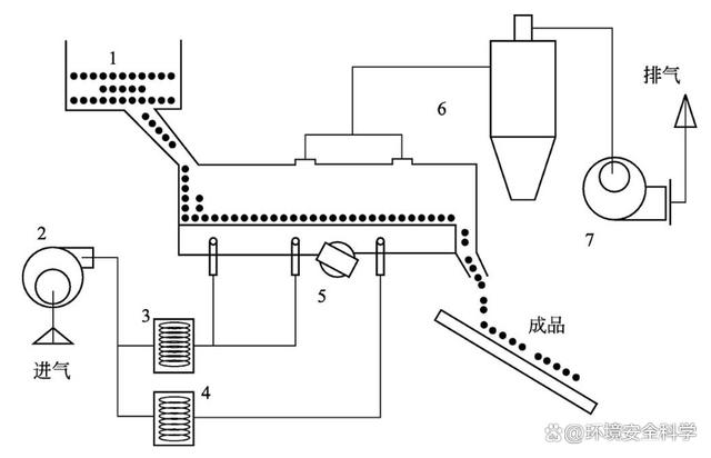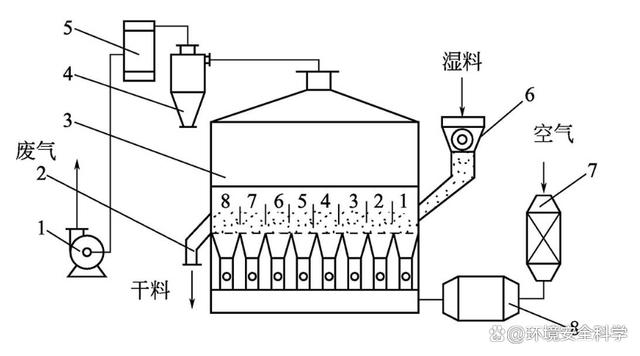 1—过滤器;2—鼓风机;3—加热器;4—料斗;5—流化床;6—卸料口 (3)卧式多室流化床干燥机 如图3所示为卧式多室流化床干燥机的工艺流程。
