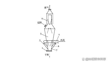 1—抽风机;2—卸料管;3—干燥机;4—旋风除尘器;5—袋式除尘器;6—摇摆颗粒机;7—空气过滤器;8——加热器 干燥机为一长方形箱式流化床,底部为多孔筛板,筛板的开孔率一般为4%~13%,孔径为1.5~2mm。筛板上方设置有竖向挡板,每块挡板可上下移动,以调节其与筛板的间距。竖向挡板将流化床分隔成8个小室,每一小室的下部有一进气支管,支管上有调节气体流量的阀门。湿物料由摇摆颗粒机连续加料于干燥机的第1室内,再由第1室逐渐向第8室移动。最后干燥后的物料从第8室卸料口卸出。而空气经过滤器到加热器加热后,分别从8个支管进入8个室的下部,通过多孔板进入干燥室,流化干燥物料。其废气由干燥机顶部排出,经旋风除尘器、袋式除尘器,由抽风机排到大气。 (4)喷动床干燥机 由于颗粒和易黏结物料的流化性能差,在流化床内不易流化干燥,故对其的干燥可采用喷动床干燥机,其结构和干燥流程如图4所示。喷动床干燥机底部为圆锥形,上部为圆筒形。高速气体从锥底进入,夹带一部分固体颗粒向上运动,从而形成中心通道。最后颗粒从床层顶部中心好似喷泉一样喷出并向四周散落,沿周围向下移动,到锥底又被上升气流喷射上去,此过程循环进行,直到达到干燥要求。
