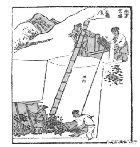 我国古代的青铜冶铸及其风险防范技术都已达到了相当高的水平。从湖北铜绿山出土的古矿冶遗址来看,当时在开采铜矿的作业中就采用了自然通风、排水、提升、照明以及框架式支护等一系列安全技术措施。在我国古代采矿业中,采煤时在井下用大竹杆凿去中节插入煤中进行通风,排除瓦斯气体,预防中毒,并用支板防止冒顶事故等。1637年,宋应星编著的《天工开物》一书中,详尽地记载了处理矿内瓦斯和顶板的“安全技术”:“初见煤端时,毒气灼人,有将巨竹凿去中节,尖锐其末。插入炭中,其毒烟从竹中透上”,见图1,采煤时,“其上支板,以防压崩耳。凡煤炭去空,而后以土填实其井”。