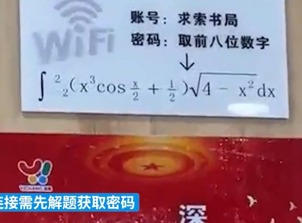 “高数WIFI”再现,三峡大学引起热议在网络发达的时代中,大学校园里的公共场所都配有无线网络服务,让学生们在校内能够更加方便地上网。食堂、寝室、教学楼、会议室等各种场所,都提供着无线网及对应的密码提示牌。近年来,不少大学开始通过特别的无线网密码来增添生活乐趣。比如,南京航天航空大学的理工学院食堂无线网密码为“高数”,而音乐学院的无线网密码为“五线谱”。这些奇葩的密码和风趣幽默的题目,为学生们的生活带来了新鲜感和乐趣。最近,三峡大学书店内的WIFI也设置成了一到高数题,需学生们解答才能得到真正的密码。这一举措难倒了许多学生,不过在大家的共同解答下,共同攻破了这一难题。
