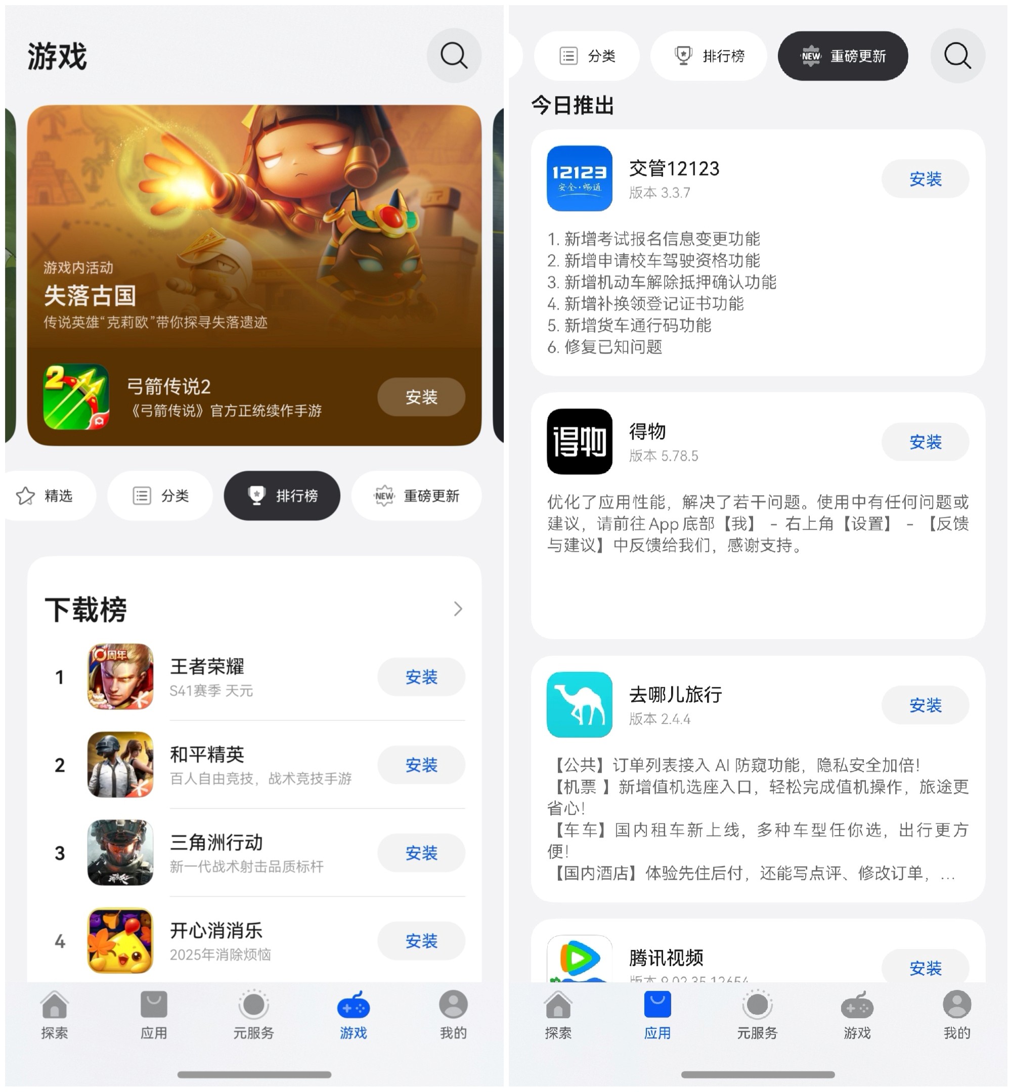 除了直接搜索APP,还可以在“应用”或“游戏”页探索。通过“排行榜”类别探索应用,可以到“下载榜”看人气,“口碑榜”看评价,发现宝藏APP!在“重磅更新”列表,可以查看已有头部APP近期的核心功能迭代、体验升级,一手掌握头部APP核心迭代,及时尝鲜优质体验。
