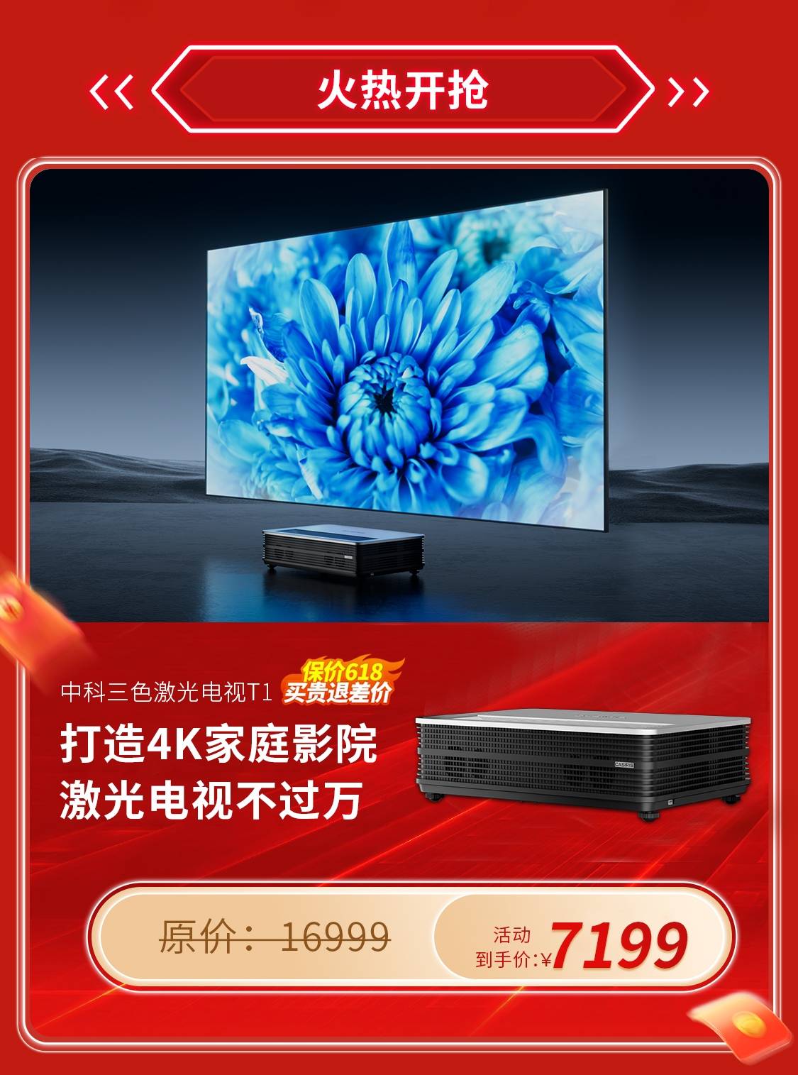 中科三色激光电视T1直降5折起!在即将到来的618当天,价格来到7199元历史最低!助力每一个家庭打造4K家庭影院,更大屏,更高清,让视听身临其境。