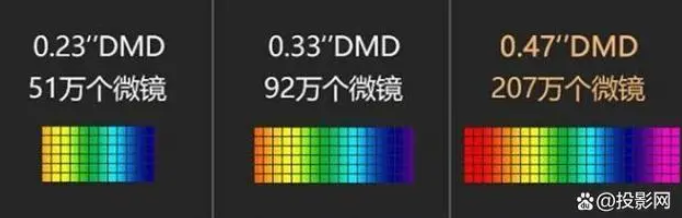 对于熟悉投影仪的朋友来说,他们都知道投影仪的分辨率主要是由显示芯片的尺寸大小决定的。芯片尺寸越大,分辨率就越高,画面就越清晰。因此0.23DMD<0.33DMD<0.43DMDD。