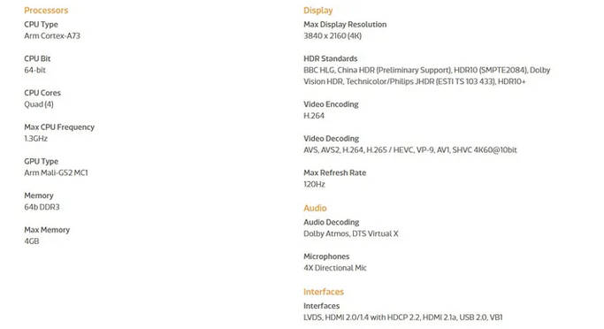 MT9669是由联发科研发的一款高性能中高端智能显示SoC。联发科作为全球第四大无晶圆厂半导体公司,在移动终端、智能家居应用、无线连接技术及物联网产品等领域均处于领先地位。它具备为4K分辨率的高端显示设备提供120Hz屏幕刷新率及120Hz运动补偿技术的能力,并兼容市面多种主流媒体格式,且运用了MediaTek的AI图像画质技术(AI-PQ),能够通过智能识别来优化画面色彩、亮度、噪点、清晰度等画质微调。
