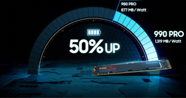 散热方面,除了散热标签,990PRO还有属于自己的一套智能散热方案。镀镍控制器和热控算法可以动态管理热量以在确保工作温度的同时,确保硬盘的稳定性能。此外,三星还优化了990PRO的电源效率,让其每瓦的性能比980PRO高出了50%,充分发挥出PCIe4.0的性能。