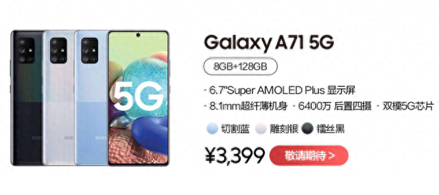 价格上,三星Galaxy A71 5G手机8+128GB售价3399元,支持拓展最大至1TB,提供切割蓝、雕刻银、镭丝黑3个配色,将于4月10日上午10点开启预售,4月18日0点正式首销/付尾款,支持6期免息。