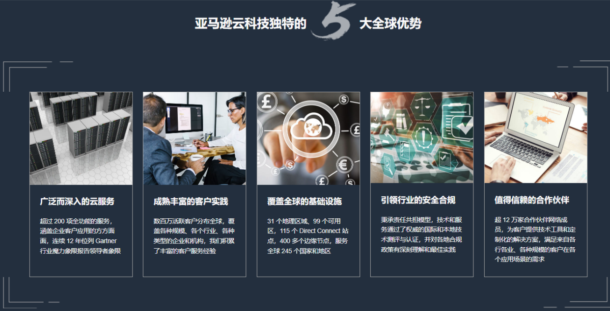 “5+1+1”的全球优势,“5”是亚马逊云科技独特的五大全球优势,包括: