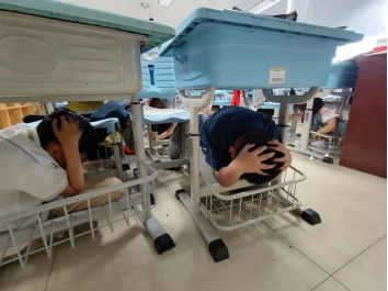 随着第一次警报声的发出,防震演练正式开始!各班教师立即停止教育教学活动。“地震来了,不要慌”,在老师的引导与帮助下,大家迅速抱头,躲在桌下,尽量蜷曲身体,降低身体重心,并用书包或课本保护头部,紧急避险。