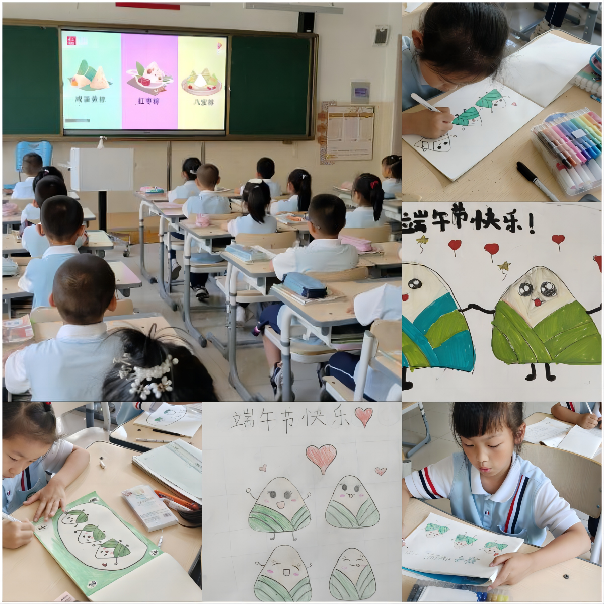体验过端午节的风俗后,同学们把对端午节的情怀寄托在画笔上,缤纷的色彩、生动有趣的画面,展现出孩子们对端午节习俗的喜爱——胖乎乎、绿油油的糯米粽跃然纸上,看得人忍不住要立即吃一口香甜可口的粽子。