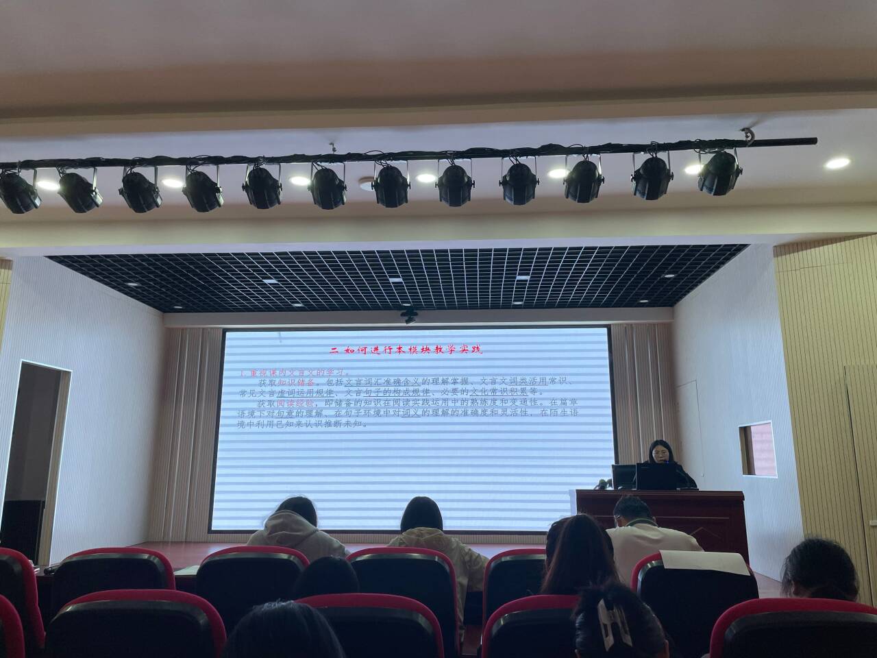 雅文中学的教师代表针对课内外文言文对比阅读,结合近期试题,分析改革形式,详细介绍了如何进行本模块教学实践,为老师们的教学指明了方向。黄金谷学校老师对课外诗歌鉴赏进行了讲授,结合近期试题分析改革总趋势:整体稳定、灵活设题、创设情境、因诗词设题。诗歌主观题考点拓展,灵活发问,在课外古诗词应对策略中建议教学中分类整合,串联课内古诗词知识,专项突破。高新一中王佳美老师,针对非连续性文本,从考点分析和教学点分析两个方面进行讲解,指出非连续性文本是最贴近学生真实生活的,呼吁教师们备考与教学一定要从教课文到教阅读、从应试之学到应用之学。遥墙中学八年级李芳老师从文学作品的选材特点、文学类作品命题指向、文学作品教学策略三个方面,遵循以“本”为本,以“纲”为纲的原则,关注语文试题,赋能教学实践,对现代文阅读进行了深度的教学思考。