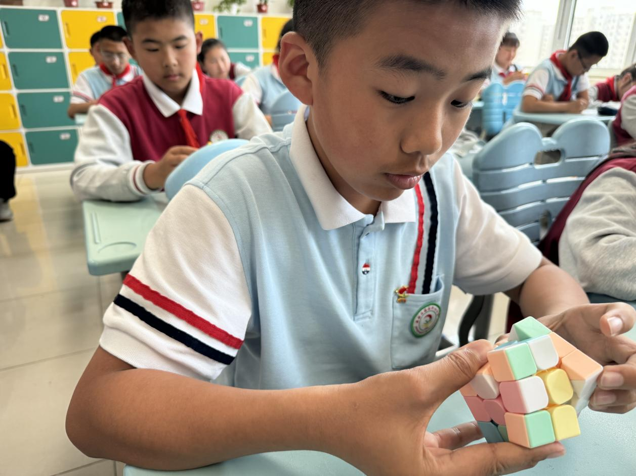 在老师的指导下,学生们积极参与,热情高涨,逐渐掌握了魔方的基本技法。魔方在孩子们手指上飞速地转动,每一次成功还原都让他们欢呼雀跃,成就感满满。