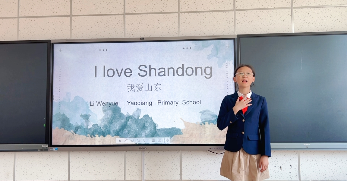 济南高新区遥墙中心小学六年级7班李文玥同学带来英文作品《I Love Shandong》用英语讲述山东,从山东简介、山东风景、山东文化、山东美食四方面,介绍了大美山东。山东是孔子的故乡,也是儒家文化的发源地,有着深厚的文化底蕴。整篇朗诵带着对山东的热爱之情与作为山东人的自豪感,向大家介绍厚道齐鲁地,美德山东人。