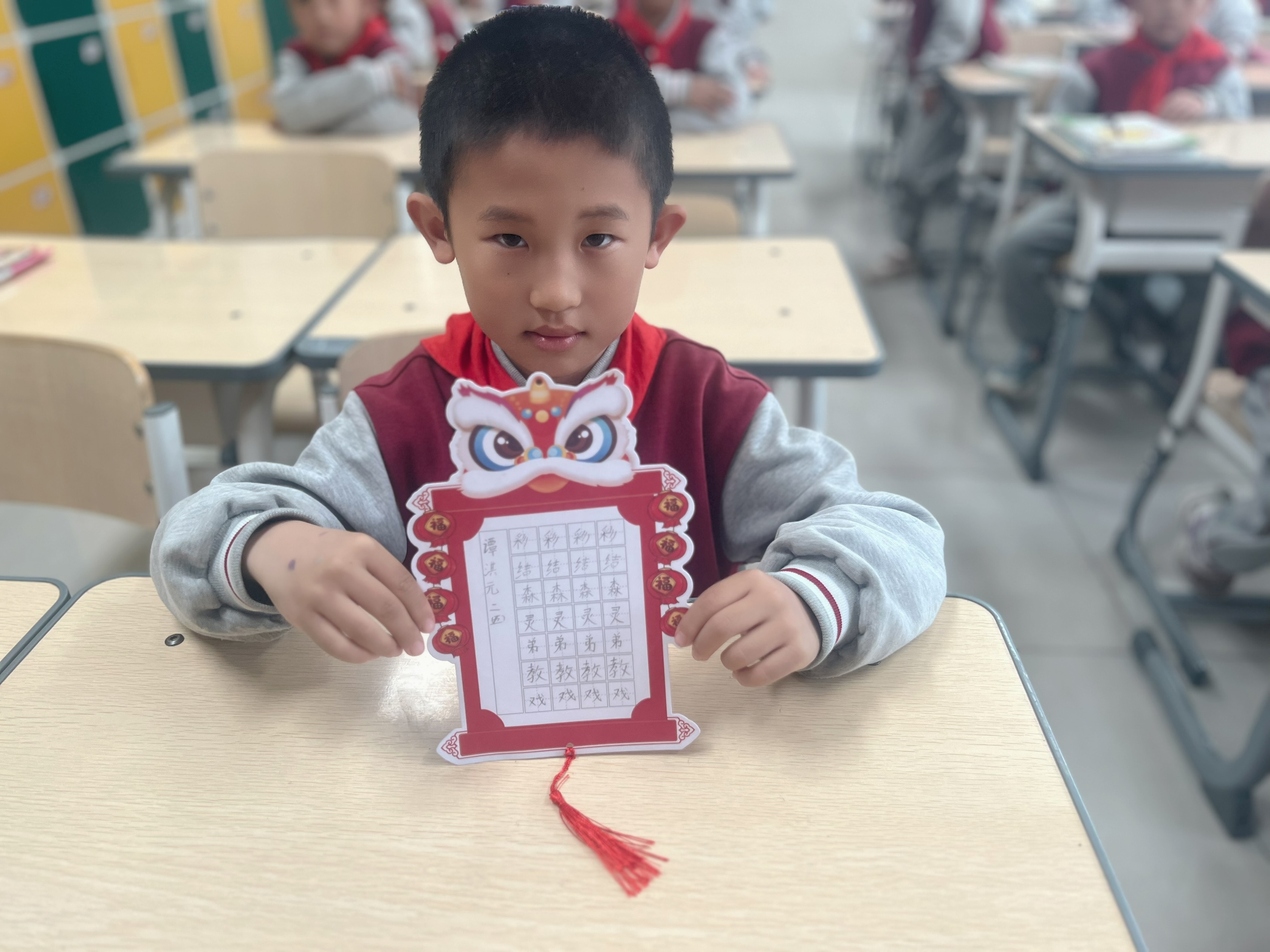 在每月练字总结之时,语文老师会挑选书写较好的学生,让其将作品誊写在具有传统元素造型的书法纸上进行全班展示。