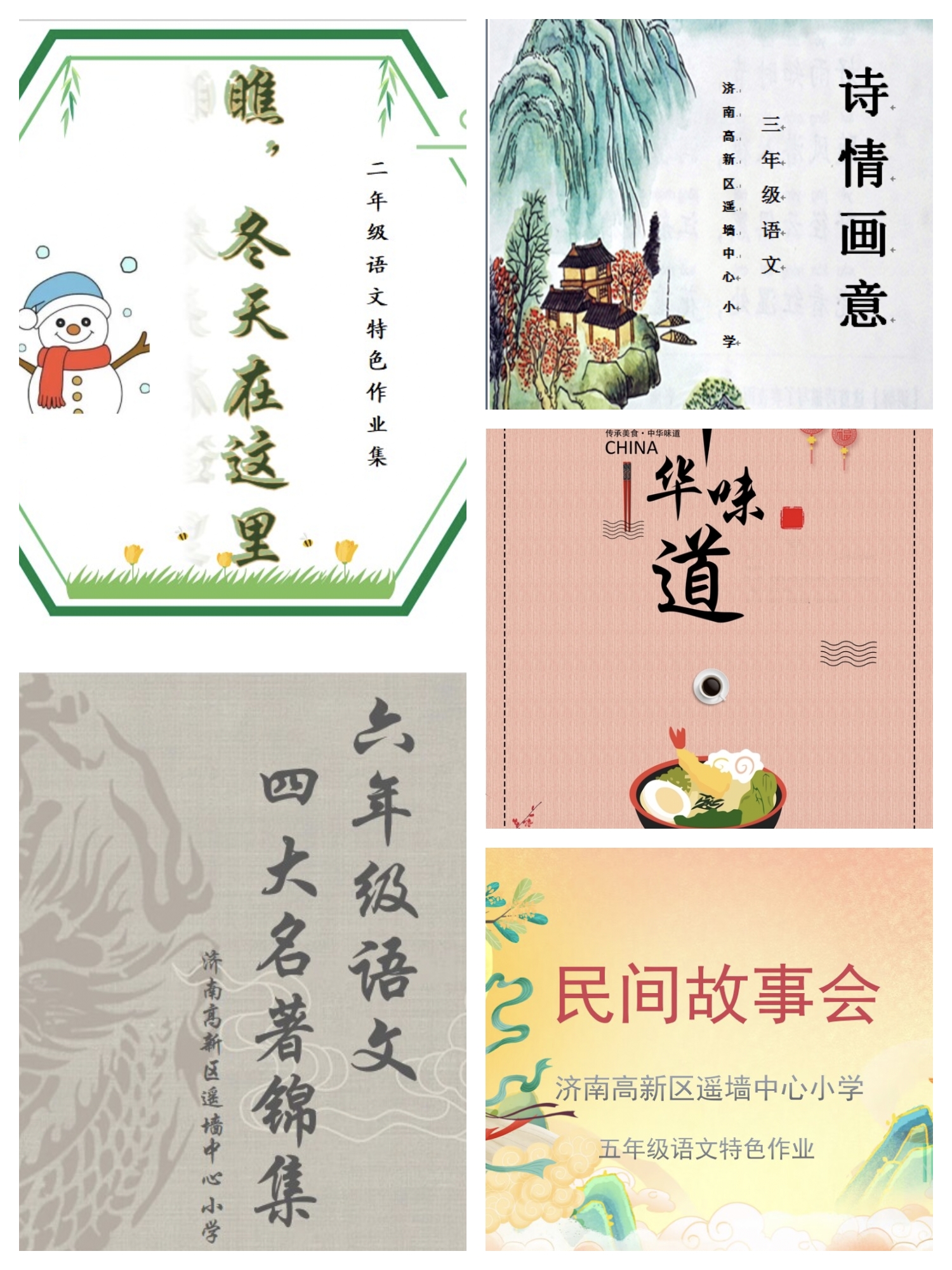 在遥墙中心小学语文老师的积极倡导下,同学们分别以“书画冬天”“诗情画意”“中华美食”“民间故事”“四大名著”为主题,展开了一系列富有创意的语文实践活动。二年级同学写冬天画冬天,三年级同学则为古诗配图,四年级同学用图文并茂的形式介绍喜欢的中华美食,五年级同学为民间故事绘制连环画,六年级同学则对四大名著中喜欢的人物做人物卡。这些特色纷呈、图文并茂的综合性实践作业,展现了孩子们丰富多彩的语文学习生活。