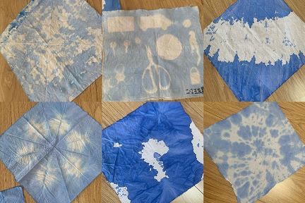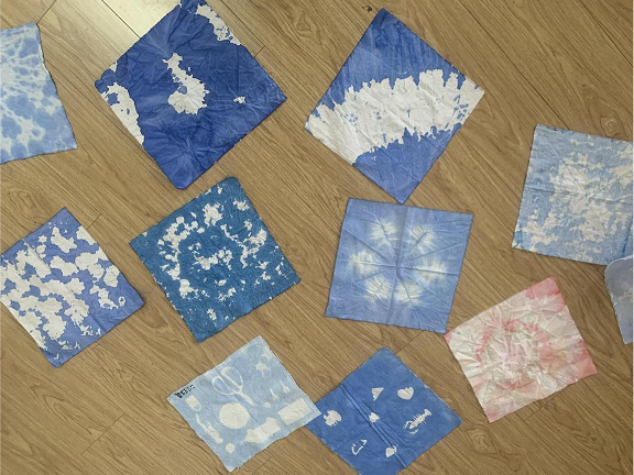 课堂上每位同学对于扎染艺术都有着自己的思考与理解,制作的扎结及配色的方法各不相同,同学们的作品从选取色彩到创意生成,再到作品完成,都体现了同学们的巧思,天马行空的想象力。