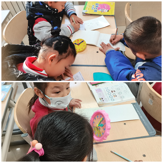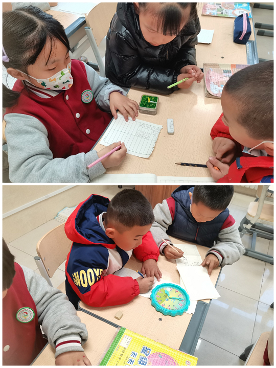 在这次学习中,学生们被分成几个小组,通过合作学习的方式,共同探索钟表的奥秘。每个小组都准备了一个钟表,学生们通过观察、触摸和操作钟表,了解了钟表的基本结构和组成部分,如表盘、指针、数字等,学生通过拨一拨、写一写等方式,更好的掌握了时间的读法和写法。