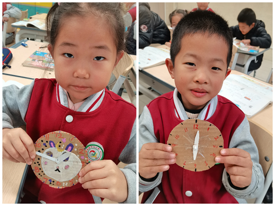为了让学生们更加深入地了解钟表的功能和使用方法,老师们还组织了自制钟表的活动。学生们利用纸板、彩笔、剪刀和胶水等材料,根据自己的理解和想象,设计并制作出了一个个精美的钟表。