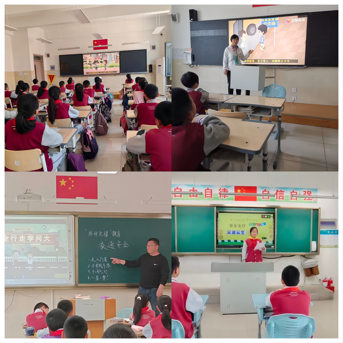 通过案例分析、讲述交通安全事故、讲解交通知识、应急处理办法等方式,引导学生不闯红灯、过街走斑马线、不翻越隔离护栏、骑非机动车不逆行等,提升了同学们的交通安全意识和文明交通素养,教育学生要自觉遵守交通规则,时刻谨记交通安全。