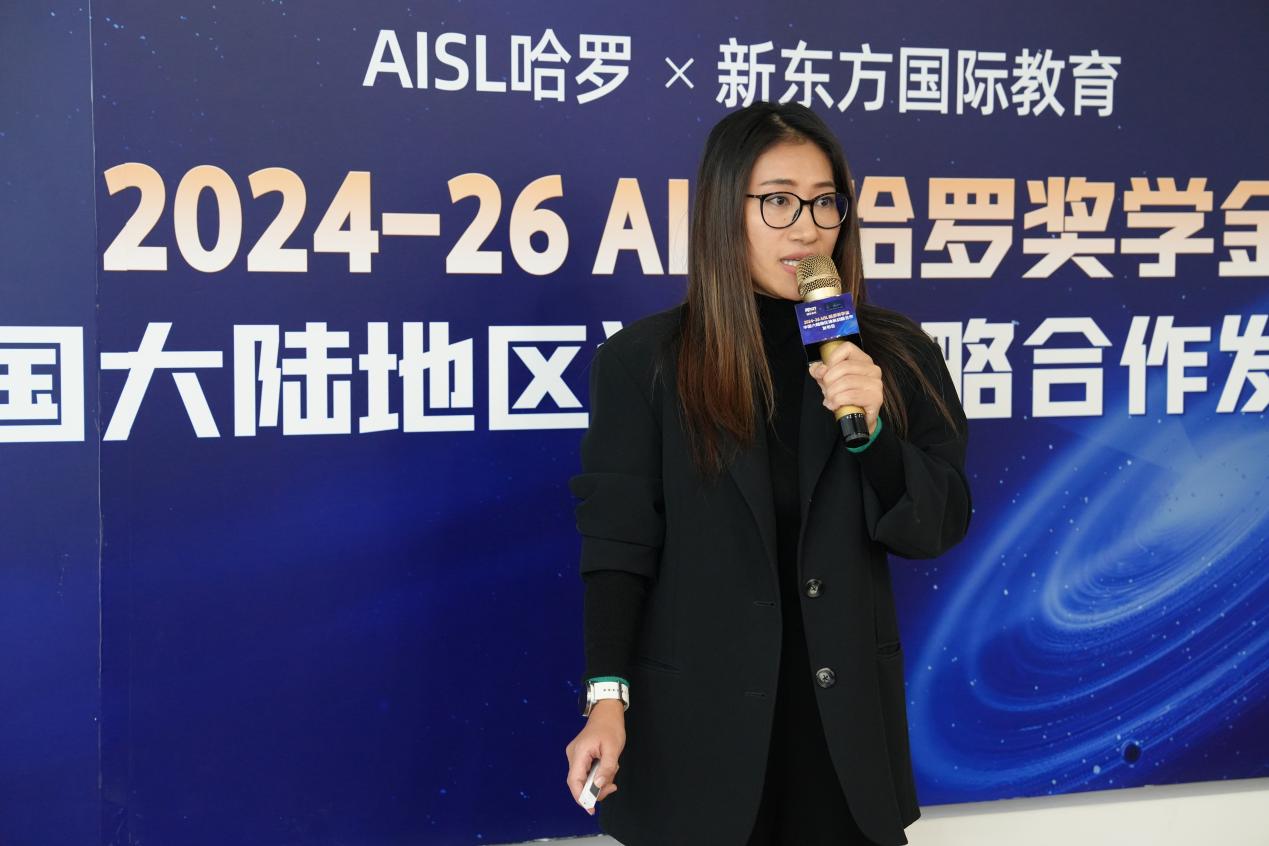 随后,新东方国际教育培训事业部副总经理、上海新东方国际教育培训中心总经理李欢也发表了精彩演讲,他提到:“新东方始终致力于帮助学生做好学术准备和备考辅导,比如,我们研发并推出了《国际课程专业词汇书》和A-Level考前专项突破课程等,希望在专业教材和教学的助力和加持下,让更多学生能高效地完成国际课程。”针对此次双方的合作权益,李欢指出:“通过此次战略合作,AISL哈罗奖学金将获得新东方国际教育三大区域国际学校咨询服务展参展资格、新东方国际教育47城择校展的免费展位,以及在新东方择校展专属模块宣讲AISL哈罗奖学金计划。”