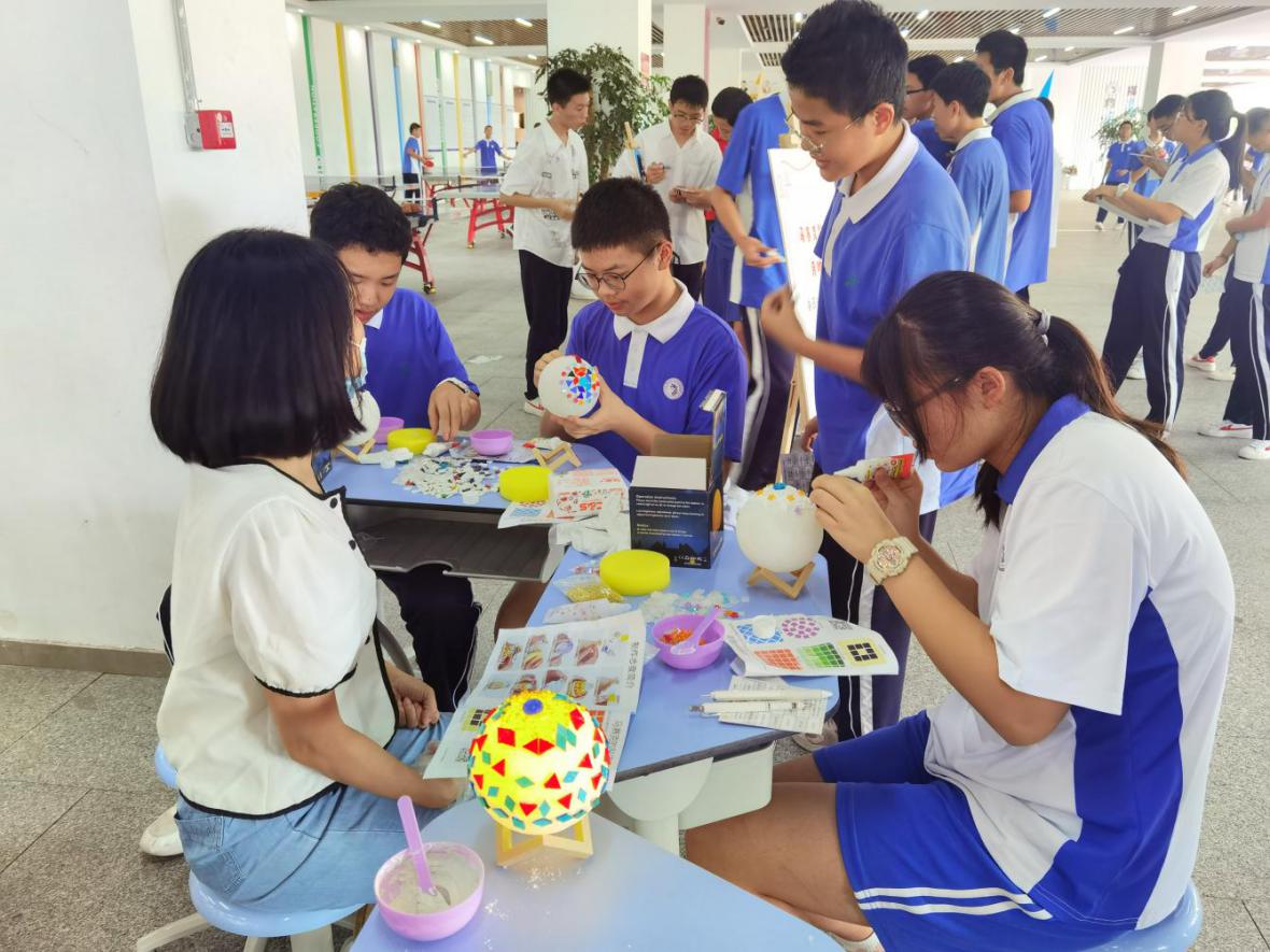 活动首先在龙华高级中学观澜校区开展,现场设置了脑力挑战类、艺术疗愈类、解忧杂货铺和团辅活动类等共计17个摊位游戏。其中,艺术疗愈体验摊位区凭借极具趣味性的活动吸引了许多学生参加,备受学生喜欢。在心理咨询师的带领下,学生充分发挥自己的想象力,制作出了一件件独树一帜的灯球作品。