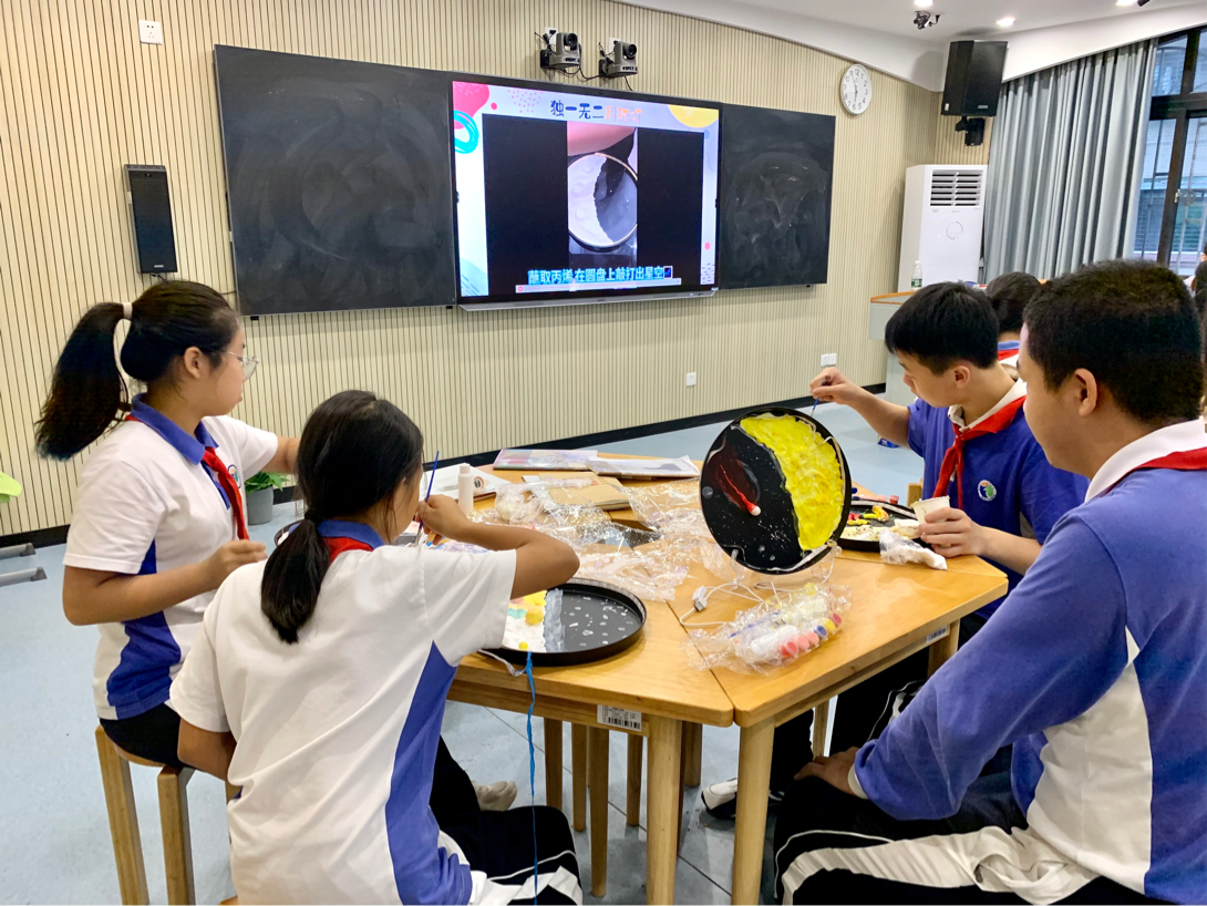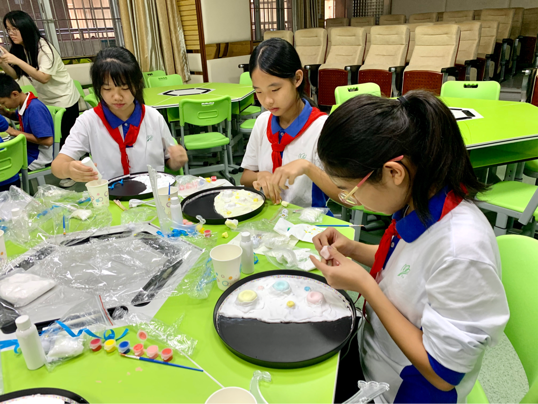在新华中学和高峰学校的活动中,学生们发挥动手能力,放飞想象力,用石英砂、绷带、粘土、丙烯颜料创造出属于自己的月球形象。制作过程中,同学们在交流互动中构思新创意,在调色、上色中收获无限乐趣,现场欢声笑语不断。心理咨询师借“月球灯”勉励学生们在今后的生活和学习中向下扎根,向上生长,走向光明,冲向自己的“外太空”!
