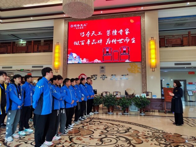 参观团一行首先来到的是山东巧夺天工家具有限公司,在讲解员的带领下,走进被评定为国家AAA级旅游景区的巧夺天工红木文化博物馆。大师们匠心独运的工艺技术以及毫厘拿捏之间的精雕细琢,给师生留下了深刻印象。