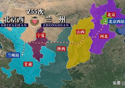Z55次列车运行线路图:北京西开往甘肃兰州,全程1569公里,Z55次列车运行线,路图:北京西开往甘肃,兰州,全程1569公,里...