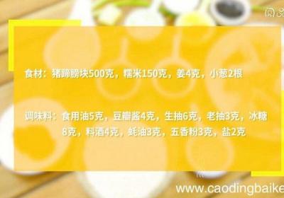 步骤1食材:猪蹄膀块500克,糯米150克,姜4克,小葱2根 。调味料:食用油5克,豆瓣酱4克,生抽6克,老抽3克,冰糖8克,料酒4克,蚝油3克,五香粉3克,盐2克 。【糯米猪蹄膀的做法 糯米猪蹄膀怎么做】步骤2姜切片 。步骤3小葱切葱花...