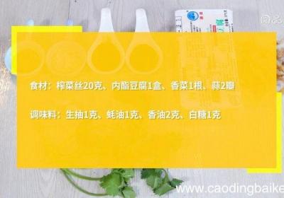步骤1食材:榨菜丝20克、内酯豆腐1盒、香菜1根、蒜2瓣 。调味料:生抽1克、蚝油1克、香油2克、白糖1克 。【榨菜拌豆腐的做法 榨菜拌豆腐怎么做】 步骤2将榨菜用冷水浸泡10分钟,捞出沥干水分,切末 。步骤3香菜切段 。步骤4蒜切末 。步...