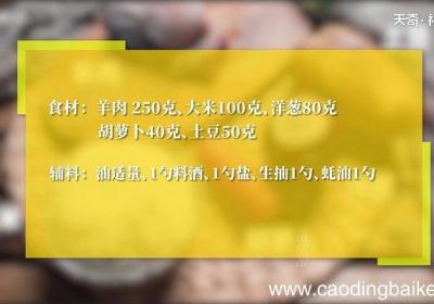 步骤1食材:羊肉250克、大米100克、洋葱80克、胡萝卜40克、土豆50克 。辅料:油适量、1勺料酒、1勺盐、生抽1勺、蚝油1勺 。步骤2羊肉用清水洗净,切成小块,加入1勺料酒,1勺盐,搅拌均匀,腌制30分钟 。步骤3胡萝卜对半切开,切小...