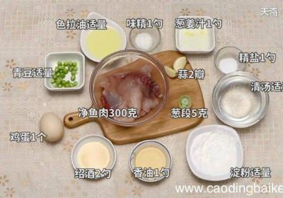 步骤1准备食材:净鱼肉300克、青豆适量、鸡蛋1个、葱段5克、蒜2瓣、淀粉适量、味精1勺、香油1勺、精盐1勺、绍酒2勺、葱姜汁1勺、清汤适量、色拉油适量 。步骤2将葱切段 。步骤3鱼肉洗净切成小丁,加入葱姜汁、精盐,腌制10分钟 。步骤4鱼...