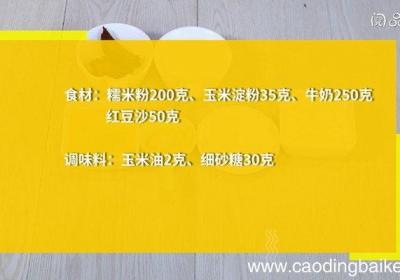 步骤1食材:糯米粉200克、玉米淀粉35克、牛奶250克、红豆沙50克 。调味料:玉米油2克、细砂糖30克 。步骤2取大碗,放入糯米粉、玉米淀粉、细砂糖,拌匀,加入牛奶,搅拌至无颗粒状 。步骤3在模具中倒入玉米油,再加入糯米液,放入红豆沙...