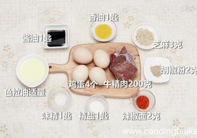 步骤1准备食材:牛精肉200克、鸡蛋4个、胡椒粉2克、辣椒面2克、芝麻3克、精盐1匙、味精1匙、香油1匙、酱油1匙、色拉油适量 。步骤2将鸡蛋放入清水锅煮熟,然后去壳 。步骤3香油和辣椒面拌匀成辣酱备用 。步骤4将牛肉洗净,剁成肉泥 。步骤...
