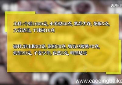 发布时间: 9小时前步骤1所需食材:牛蛙1000克,小米椒30克,紫苏少许,花椒5克,大蒜适量,干辣椒10克 。所需调料:野山椒30克,泡椒30克,郫县豆瓣酱40克,蚝油20克,子姜少许,孜然2克,啤酒适量 。步骤2姜切末 。步骤3小米椒切末 。步骤4泡椒切末...