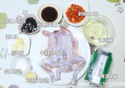 发布时间: 8小时前步骤1准备食材:牛蛙200克、剁椒50克、蒜3瓣、姜1块、盐1茶匙、啤酒1罐、蚝油1茶匙、蒸鱼豉油1汤匙、鸡精1茶匙、油适量 。步骤2姜切片 。步骤3蒜拍扁 。步骤4牛蛙剁成块 。步骤5起锅倒油 。油温6成热,下入牛蛙炸1分钟,捞出沥油 。...