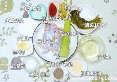 发布时间: 7小时前步骤1准备食材:牛蛙200克、莴笋50克、酸菜100克、姜1块、蒜3瓣、小米椒3个、泡椒20克、料酒1汤匙、白醋1汤匙、白糖1茶匙、盐1茶匙、胡椒粉1茶匙、生粉适量、油适量 。步骤2姜切片 。【酸汤牛蛙的做法 酸汤牛蛙怎么做】步骤3莴笋切片...