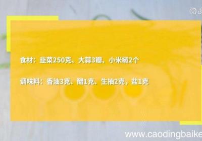 步骤1食材:韭菜250克、大蒜3瓣、小米椒2个调味料:香油3克、醋1克、生抽2克,盐1克步骤2韭菜切段,锅中水沸后,放入韭菜,煮30秒,捞出,装入盘中 。步骤3大蒜切末 。步骤4小米椒切圈 。步骤5取小碗,放入香油、醋、生抽、蒜末、小米椒圈...
