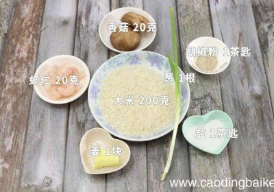 步骤1准备食材:大米200克、虾仁20克、香菇20克、葱1根、姜1块、盐1茶匙、胡椒粉1茶匙 。步骤2大米浸泡20分钟 。步骤3香菇切丁 。步骤4葱切葱花 。步骤5姜切末 。步骤6砂锅中放入大米、胡椒粉,再加适量清水,大火烧开,转小火煲30...
