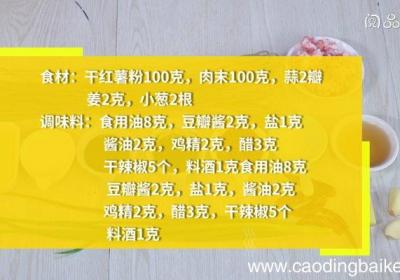 步骤1准备食材:干红薯粉100克,肉末100克,蒜2瓣,姜2克,小葱2根、食用油8克,豆瓣酱2克,盐1克,酱油2克,鸡精2克,醋3克,干辣椒5个,料酒1克 。步骤2蒜切末 。步骤3姜切末 。步骤4小葱切葱花 。步骤5干辣椒切段 。步骤6热锅...