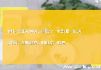 步骤1食材:豌豆尖200克、鸡蛋2个、小葱1根、姜1克 。调味料:食用油5克、花椒1克、盐2克 。【鸡蛋汤怎么做 鸡蛋汤的做法】步骤2小葱切葱花 。步骤3姜切末 。步骤4鸡蛋打散 。步骤5热锅倒油、油温6成热时、下蛋液、炒散、加姜、花椒、炒...